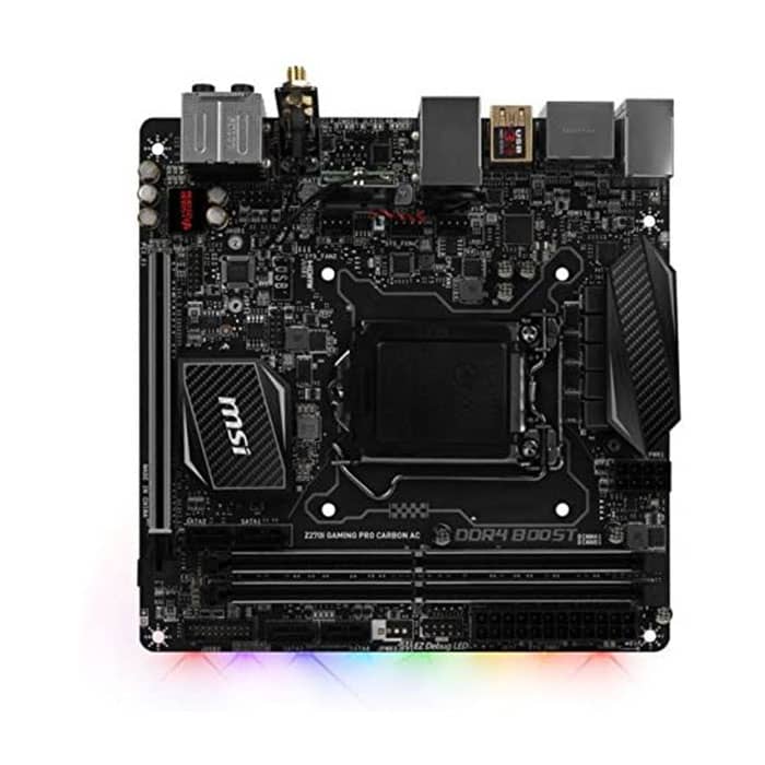مادربرد Z270I Gaming Pro Carbon AC از MSI دارای فرم فاکتور mini-ITX، چیپست Intel Z270 و سوکت LGA1151 است، بنابراین میتوانید یک سیستم فوقالعاده جمعوجور با پردازندههای نسل ششم یا هفتم اینتل ایجاد کنید. این مادربرد تا 32 گیگابایت ماژول حافظه DDR4 را به همراه چهار درایو ذخیره سازی و نوری مبتنی بر SATA پشتیبانی می کند. برای عملکرد، مجهز به یک اسلات M.2 برای یک SSD فوق سریع و همچنین یک اسلات PCIe 3.0 x16 است که به شما امکان میدهد یک دستگاه بازی بسازید. علاوه بر این، Z270I دارای یک ماژول داخلی 802.11ac/Bluetooth 4.2 و دو آنتن خارجی برای ارائه اتصال بی سیم به اینترنت و دستگاه های دارای بلوتوث است.MSI Z270I Gaming Pro Carbon AC به نور RGB مجهز شده است تا بتوانید داخل کیس خود را با حداکثر 16.8 میلیون رنگ و همچنین هفده افکت روشن کنید. این در حالی است که سیستم روشنایی این برد را می توان به راحتی از طریق یک برنامه بازی یا دستگاه تلفن همراه کنترل کرد. جدا از جلوه های نور، پنل پشتی این مادربرد دارای اتصالات اترنت گیگابیتی، PS/2، DisplayPort و HDMI است. برای اتصال USB، دو پورت USB 3.1، دو USB 3.0 و دو پورت USB 2.0 موجود است. برای اتصال آسان، یکی از پورت های USB 3.1 دارای طراحی Type-C است. از دیگر ویژگی های قابل توجه می توان به پردازنده صوتی Realtek ALC1220 داخلی به همراه شش جک صدا برای تکمیل تجربه چند رسانه ای اشاره کرد. این مادربرد از پردازنده های Intel Core i7/i5/i3/Pentium/Celeron در بسته LGA1151 پشتیبانی می کند. این پردازنده ها دارای گرافیک یکپارچه، حافظه و کنترلرهای PCI-Express برای ارائه گرافیک داخلی، پشتیبانی از حافظه دو کاناله DDR4 و خطوط PCI Express 3.0 برای عملکرد گرافیکی هستند. خرید مادربرد ام اس آی مدل Z270I GAMING PRO CARBON ACمی تواند یک انتخاب عالی برای کابران حرفه ای باشد.
