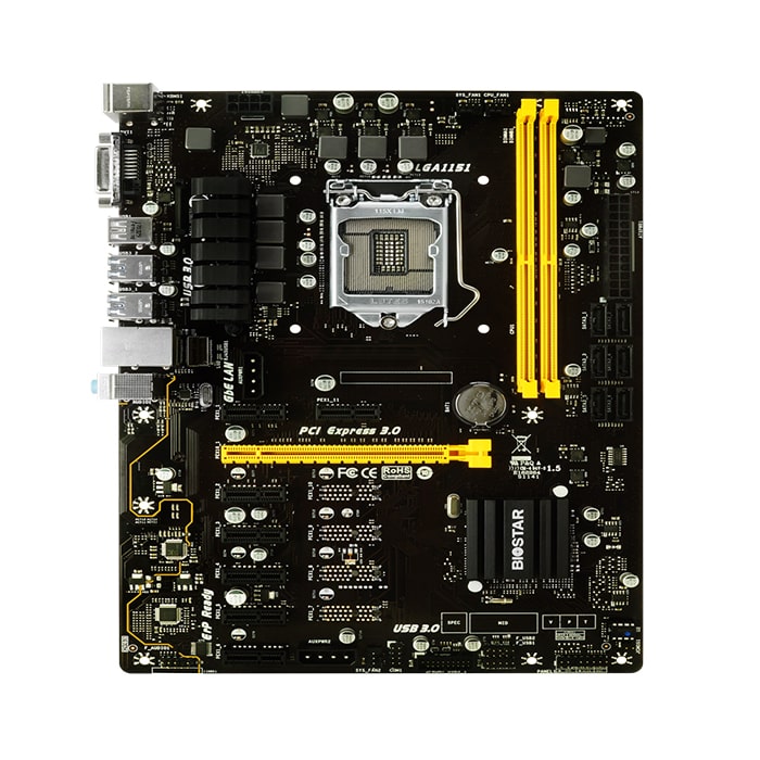 مادربرد Biostar TB250-BTC+ یک مادربرد تخصصی برای ماینینگ است که با 8 اسلات PCIe ، پشتیبانی از پردازنده های اینتل نسل 6 و 7 و طراحی پایدار PCB ، امکان ساخت ریگ استخراج ارز دیجیتال با کارایی و پایداری بالا را فراهم می کند .