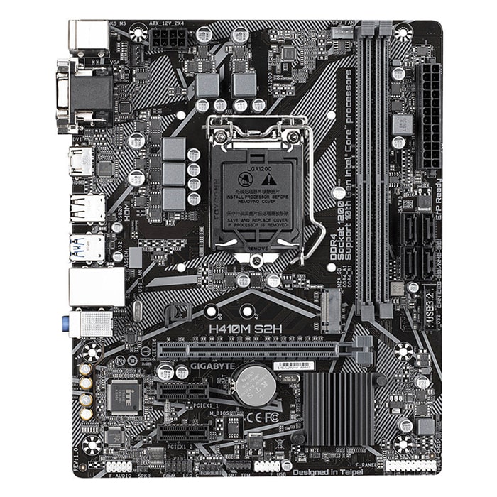 مادربرد Gigabyte H410M S2H (Rev 1.x) یک مادربرد Micro-ATX ساده و قابل اعتماد است که از پردازنده های اینتل نسل دهم پشتیبانی می کند و با خروجی های HDMI ، DVI-D و VGA و اسلات M.2 فضای کافی برای اسمبل سیستم خانگی یا اداری فراهم می کند .