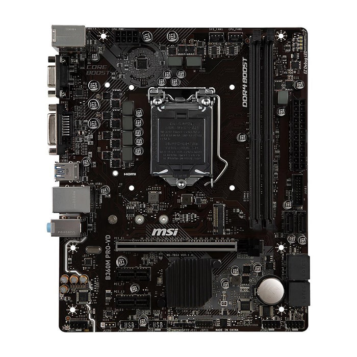 مادربرد ام اس آی B360M PRO-VH یک مادربرد کاربردی و اقتصادی با چیپست B360 و سوکت LGA1151 است که از پردازنده های نسل 8 و 9 اینتل پشتیبانی می کند . این مدل با فرمفکتور microATX ، پورت های کامل و پشتیبانی از حافظه DDR4 ، گزینه ای مناسب برای سیستم های اداری ، خانگی و آموزشی محسوب می شود .