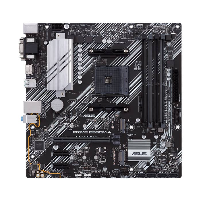 مادربرد ایسوس مدل PRIME B550M-A سوکت AM4با چیپست AMD B550 از نسل سوم پردازنده های AMD Ryzen با سوکت AM4 طراحی و به بازار عرضه شده است. این مادربرد قادر است انرژی زیادی را در یک فرم کوچک جمع کند. با توجه به اینکه مادربرد ایسوس مدل PRIME B550M-A سوکت AM4 از پهنای باند بزرگ داده PCIe 4.0 بهره میبرد، عملکرد بالایی را برای کارهای سخت مانند بازی، ویرایش ویدیو و موارد دیگر ارائه می دهدPRIME B550M-A دارای خنک کننده پیشرفته است و به راحتی دو درایو SSD M.2 و چهار درایو ذخیره سازی SATA III را پشتیبانی می کند . این در حالی است که اسلات PCIe 4.0 x16 آن میتواند یک کارت گرافیک پیشرفته را در خود جای دهد. به لطف خرید مادربرد ایسوس مدل PRIME B550M-A سوکت AM4حداکثر توانید با اتصال سه نمایشگر به پورت های HDMI، DVI-D و VGA مادربرد، از گرافیک یکپارچه CPU AMD استفاده کنید. مادربرد ایسوس مدل PRIME B550M-A سوکت AM4پردازنده های نسل سوم AMD Ryzen AM4 و پهنای باند بالای حافظه PCIe 4.0 را از طریق چیپست B550 برای حداکثر کارایی جفت می کند. برخورداری از فناوری نورپردازی RGB Aura Sync از دیگر ویژگی های مهم این مادربرد محسوب می شود. فناوری Aura Sync به شما امکان می دهد تجهیزات نورپردازی مانند LED های RGB و نوارهای نور را روی هدرهای RGB داخلی متصل کنید، سفارشی کنید و کنترل کنید. شما می توانید از بین انواع از پیش تنظیم های روشنایی که شامل Static، Strobing و Color Cycle هستند، انتخاب کنید. این تنظیمات از پیش تنظیم شده را می توان با تجهیزات جانبی دارای قابلیت Aura مانند صفحه کلید، ماوس، مانیتور و غیره همگام کرد. هدرهای RGB قابل آدرس دهی Gen 2 می توانند تعداد LED ها را در یک دستگاه سازگار تشخیص دهند تا جلوه های روشنایی را بیشتر تنظیم کنند.