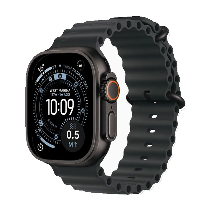 ساعت هوشمند Apple Watch Ultra 3 با بدنه تیتانیوم مشکی 49 میلی متری و بند Ocean ، مقاوم و حرفه ای طراحی شده و امکانات پیشرفته سلامت ، مسیریابی و ورزش های سنگین را ارائه میدهد .